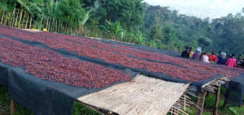 Kawa z mikrorregionu Adado w Yirgacheffe, uprawiana na wysokościach 2150–2400 m n.p.m. przez rodzinę Dinigiu, od pokoleń związaną z tym miejscem. Dojrzałe, ręcznie selekcjonowane wiśnie są sortowane flotacyjnie i suszone na afrykańskich łożach przez 11–15 dni, co nadaje naparowi świeży, delikatnie cytrusowy charakter z nutami trawy cytrynowej, limonki i marakui.