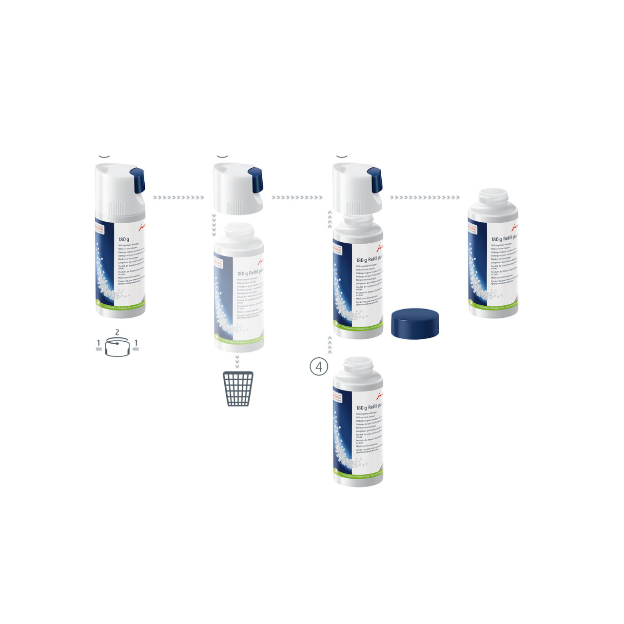 Opakowanie uzupełniające 180 g wystarcza na aż 60 pełnych cykli czyszczenia systemu mleka. Dzięki praktycznemu dozownikowi jedno kliknięcie tabletki = optymalna dawka – bez straty produktu i wysiłku. Taka oszczędność i precyzja sprawiają, że utrzymanie najwyższej jakości pianki staje się proste i szybkie.
